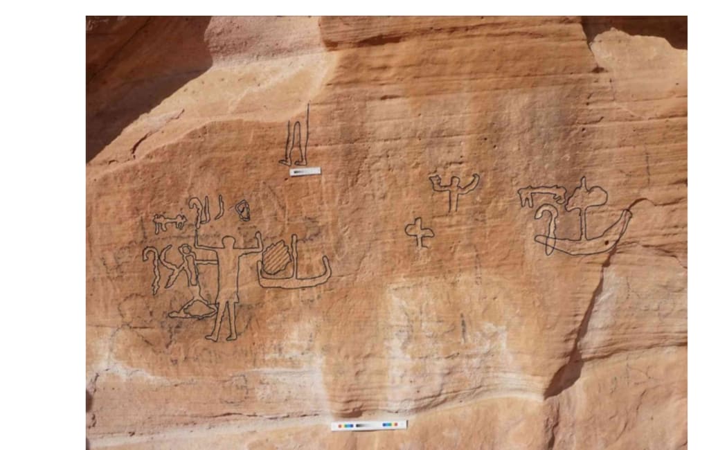 Later desert travellers and contemporary Arabic graffiti added new markings to the same rock centuries after the original sculpture. The fact that some lines on the right seem to replicate portions of the earlier image indicates that it was still noticed by later visitors.